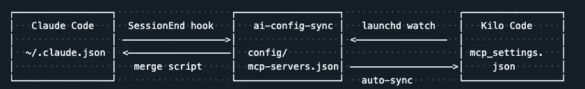 ~/.claude.json → [extract] → ai-config-sync/config/mcp-servers.json → [sync] → Kilo
