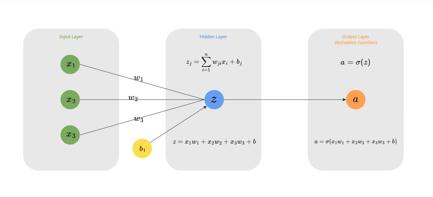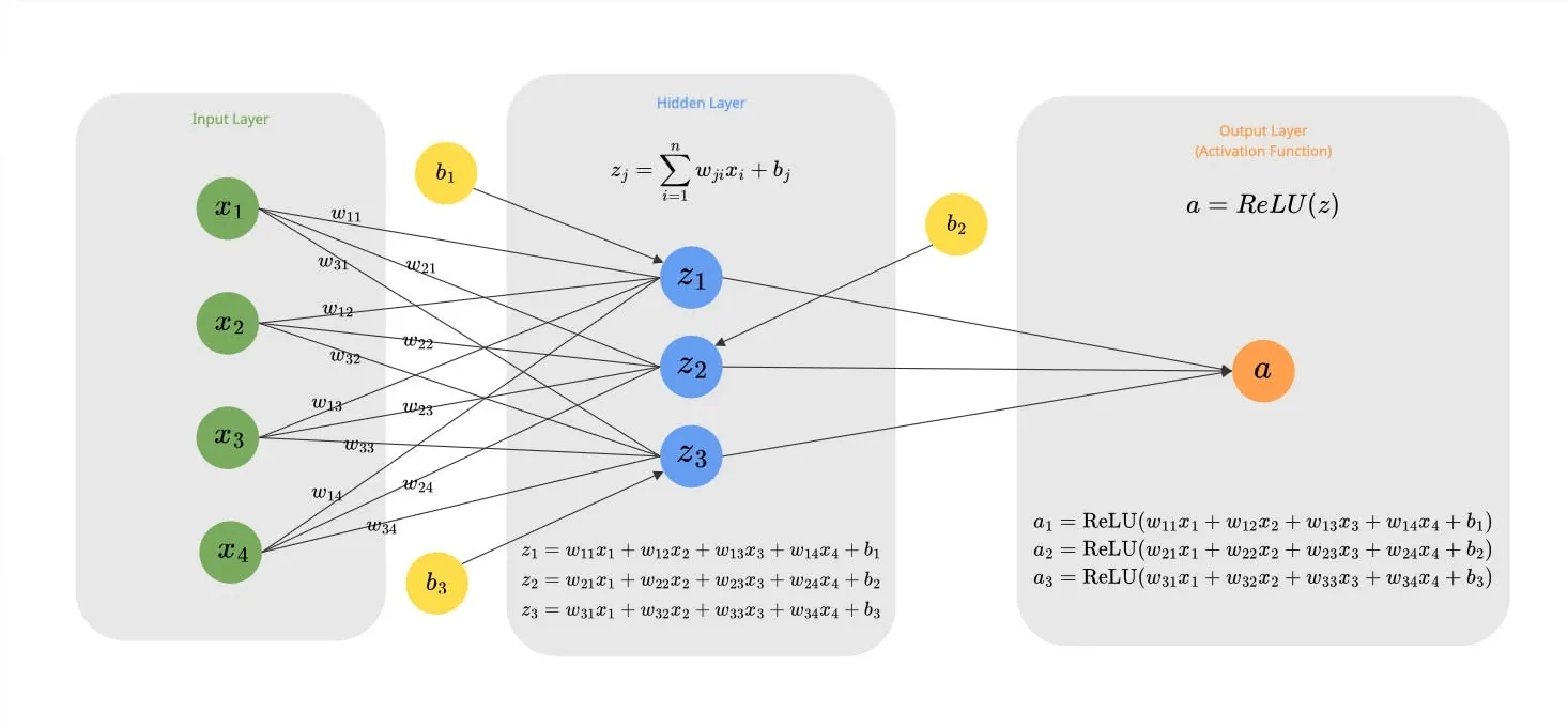 A Neuron is the fundamental atomic unit. It takes multiple inputs (), multiplies each by a distinct weight (), and sums them up. Finally, it adds a bias () to this sum. This linear operation allows the neuron to “weigh” the importance of different inputs.