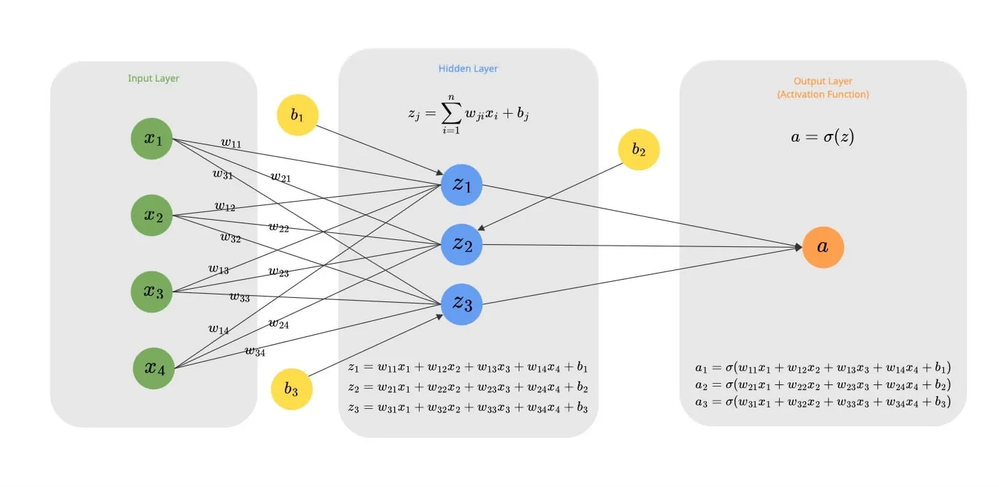 A Neuron is the fundamental atomic unit. It takes multiple inputs (), multiplies each by a distinct weight (), and sums them up. Finally, it adds a bias () to this sum. This linear operation allows the neuron to “weigh” the importance of different inputs.